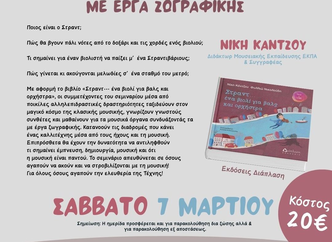 Με αφορμή το βιβλίο «Στραντ… ένα βιολί για βαλς και ορχήστρα» οι συμμετέχοντες του σεμιναρίου μέσα από ποικίλες αλληλεπιδραστικές δραστηριότητες ταξιδεύουν στον μαγικό κόσμο της κλασικής μουσικής, γνωρίζουν γνωστούς συνθέτες και μαθαίνουν για τα μουσικά όργανα συνδυάζοντάς τα µε έργα ζωγραφικής. Κατανοούν τις διαδρομές που κάνει ένας καλλιτέχνης μέσα από τους ήχους και τη μουσική. Επιπρόσθετα θα έχουν την δυνατότητα να αντιληφθούν τι σημαίνει έμπνευση, δημιουργία, μουσική και ότι η μουσική είναι παντού. Το σεμινάριο απευθύνεται σε όσους αγαπούν να ακούν και να στροβιλίζονται με τη μουσική! Για όλους όσους αγαπούν την ελευθερία της Τέχνης!